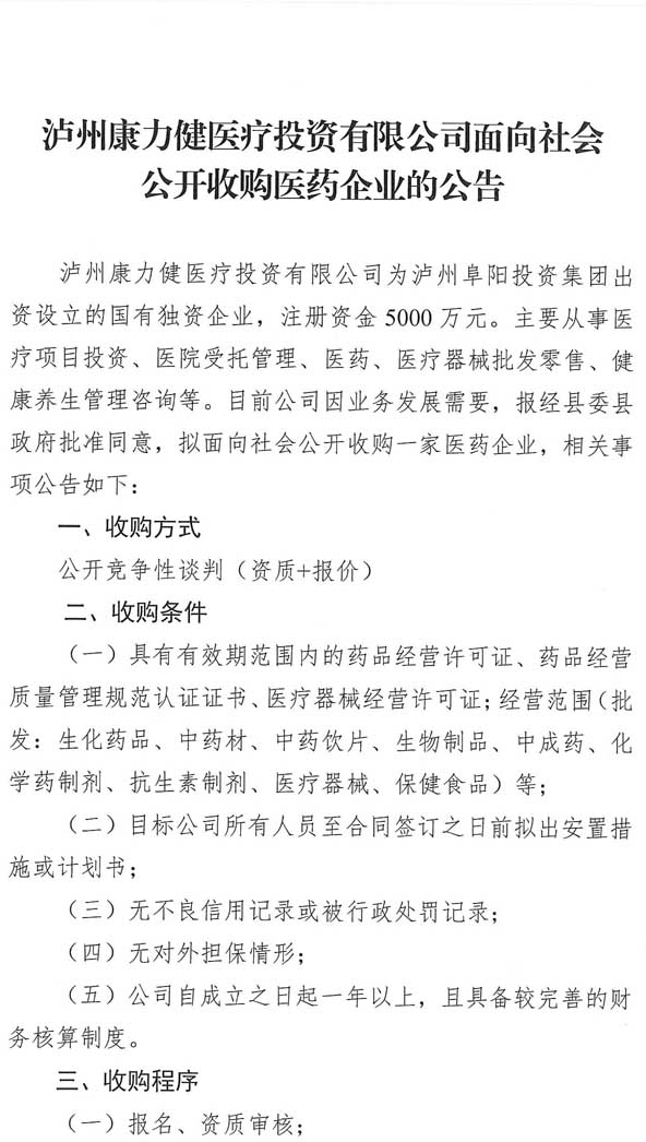 瀘州康力健醫(yī)療投資有限公司面向社會(huì)公開收購醫(yī)藥企業(yè)的公告.doc